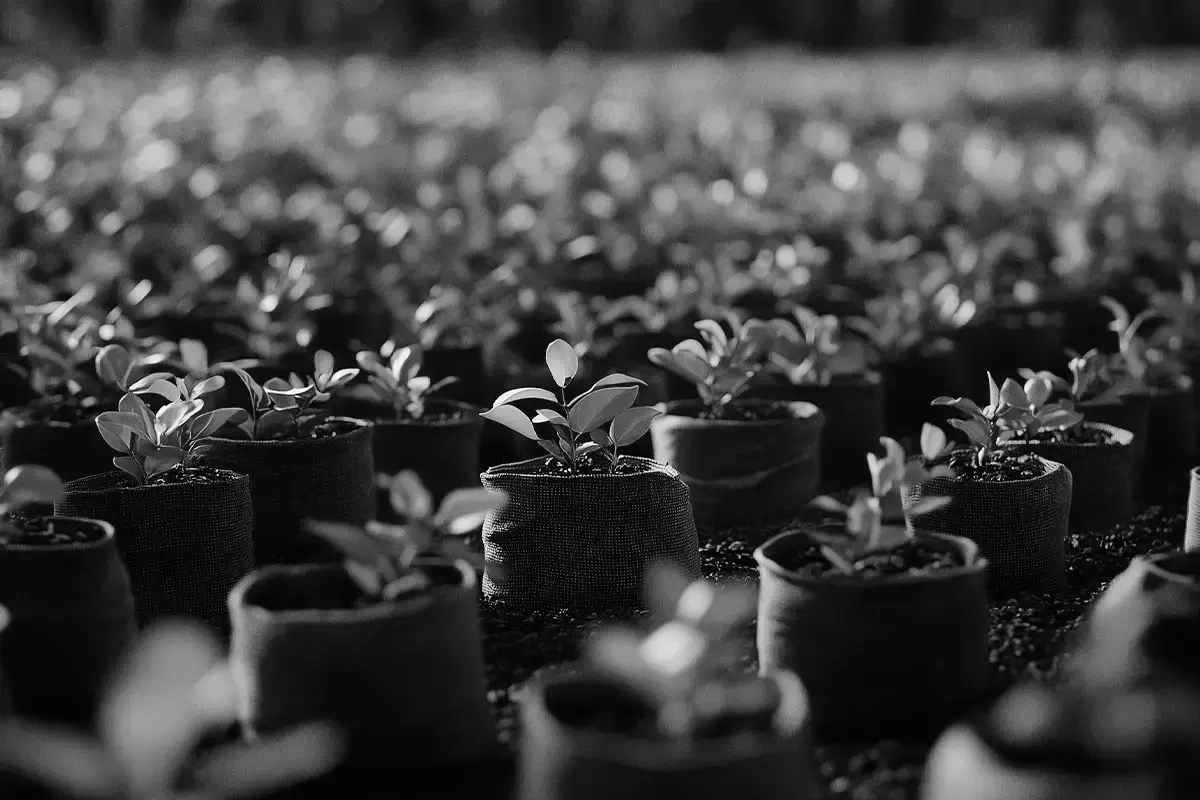 A man observing and monitoring the condition of plants in a newly planted forest. AI generated picture.
